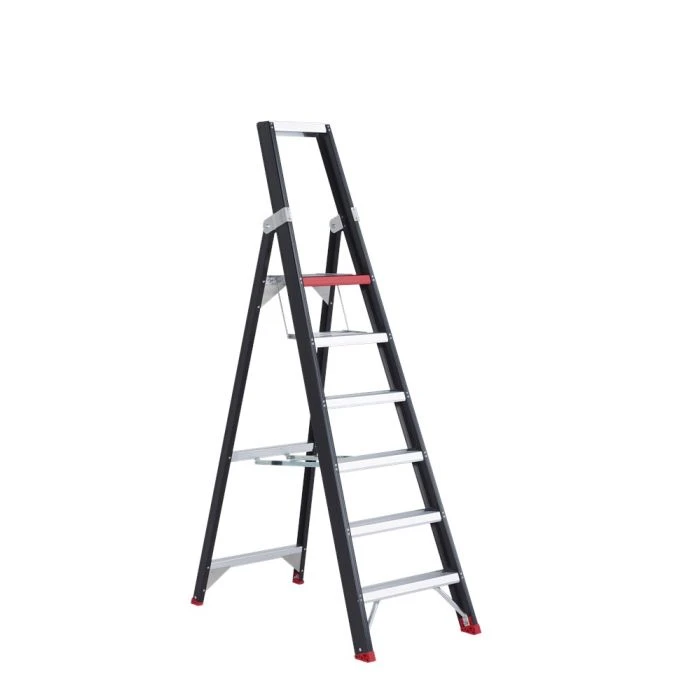 Extra bijzonder zijn de twee bordessen boven elkaar. Daarmee beschik je over twee veilige en comfortabele werkplekken. Door de drukvaste spreidbeveiliging weet je zeker dat de trap niet ongewild inklapt. Bovendien sta je stevig en stabiel door de grote antislip-voeten en de omsloten scharnieren. Een trap op het hoogste niveau.
