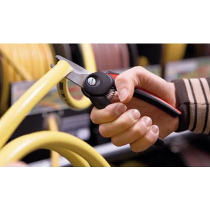 Combischaar recht, met een schaarkop van roestvrij staal. De schaar heeft ergo-handgrepen en voorkomt zo sneller vermoeidheid.