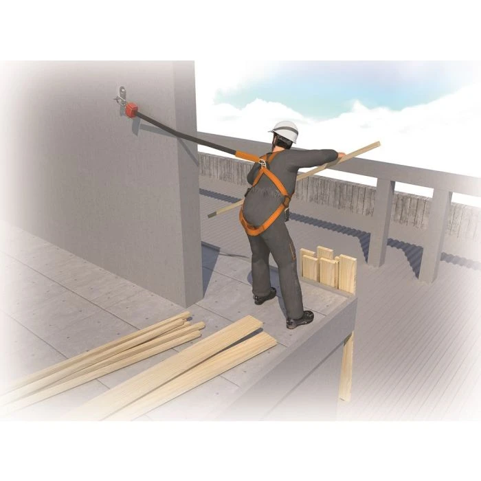 VERTICAL 2,50 M – Kant-en-klare valbeschermingskit: Valbeschermingsharnas met 2 bevestigingspunten (rug – borst). 2 gespen. Comfortregeling via 2 zijdelingse beugels aan het harnas. (Ref. HAR12). Valbeveiligingslsysteem met automatische lijnspanner type band 46 mm met energie-absorber Beschermend omhulsel. 1 verbindingsstuk AM002 (Ref. AN102). 1 verbindingsstuk AM002. Harnas voor valbeveiliging: Polyester riemen. Valbeveiliging met automatische blokkering: Kunststoffen carter, polyester riem. Karabijnhaak: Staal.