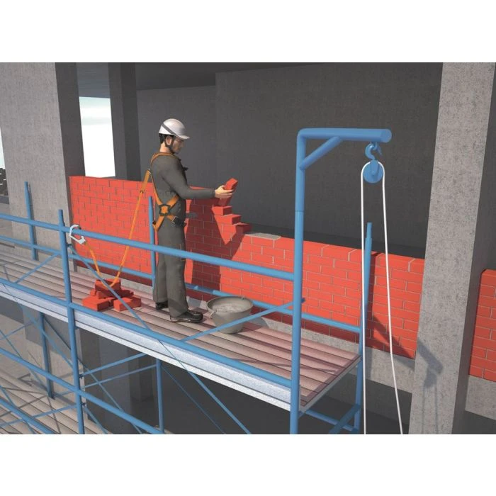 SCAFFOLDING – Kant-en-klare valbeschermingskit: Valbeschermingsharnas met 2 bevestigingspunten (rug – borst). 2 gespen. Comfortregeling via 2 zijdelingse beugels aan het harnas. (Ref. HAR12). Valbeveiligingssysteem met energie-absorber met vallijn in de vorm van een band, lengte 2 m, inclusief 1 verbindingsstuk AM002 en 1 haak AM022 (Ref. AN203200CD). Harnas voor valbeveiliging: Polyester riemen. Energie-absorberende lijn: Polyamide lijn. Karabijnhaak en haak: Staal.