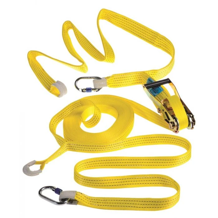 Gecertificeerde, tijdelijke horizontale veiligheidslijn type band voor 2 personen Lengte en spanning verstelbaar met een ratelspanner. Uitgerust met 2 karabijnhaken AM002 en 2 verankeringsringen type O. Opbergtas inbegrepen. Gespen: Leer. Riemen: Polyester. Karabijnhaak: Staal.