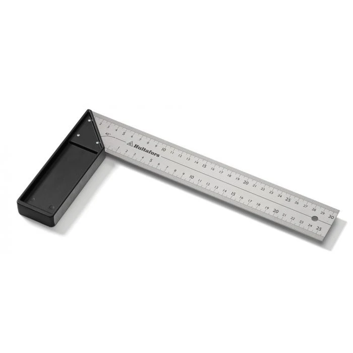 Winkelhaak met aluminium blok en millimeterschaalverdeling op de bovenste en onderste rand van het blad.