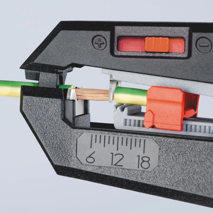 - Met instelbare lengteaanslag van 6,0 – 18,0 mm voor gelijke afstriplengtes.