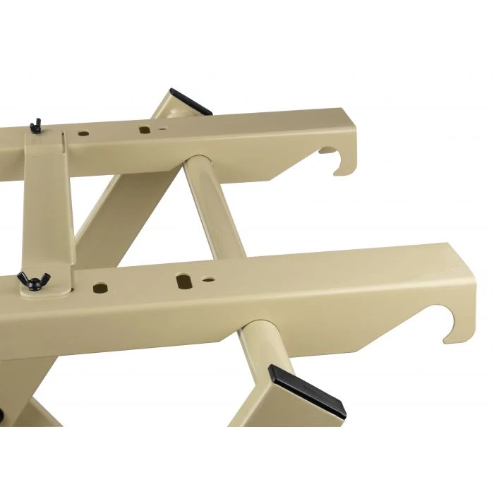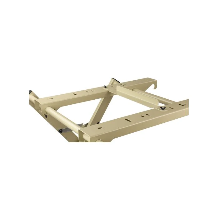 De breedte is 60cm en de lengte 74cm; bovenop bevinden zich 2 dwarsbalken die verstelbaar zijn, al naar gelang de machine die erop wordt gemonteerd.
