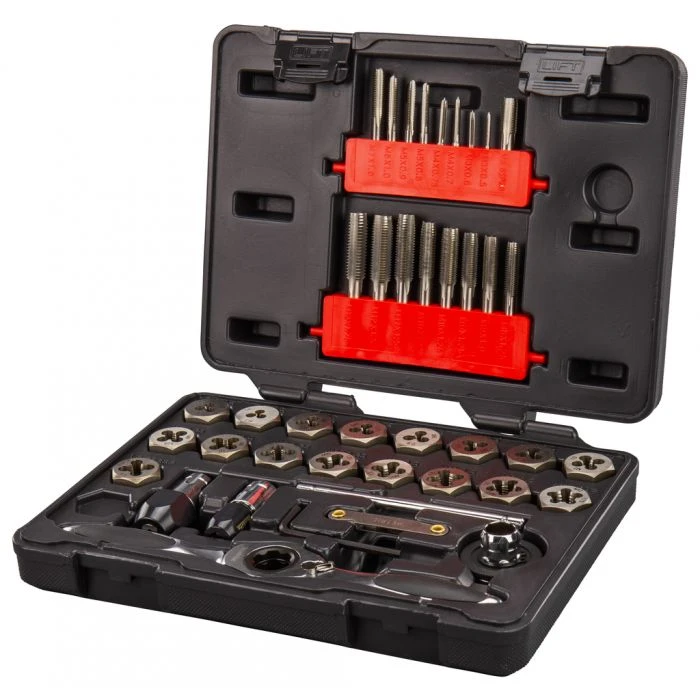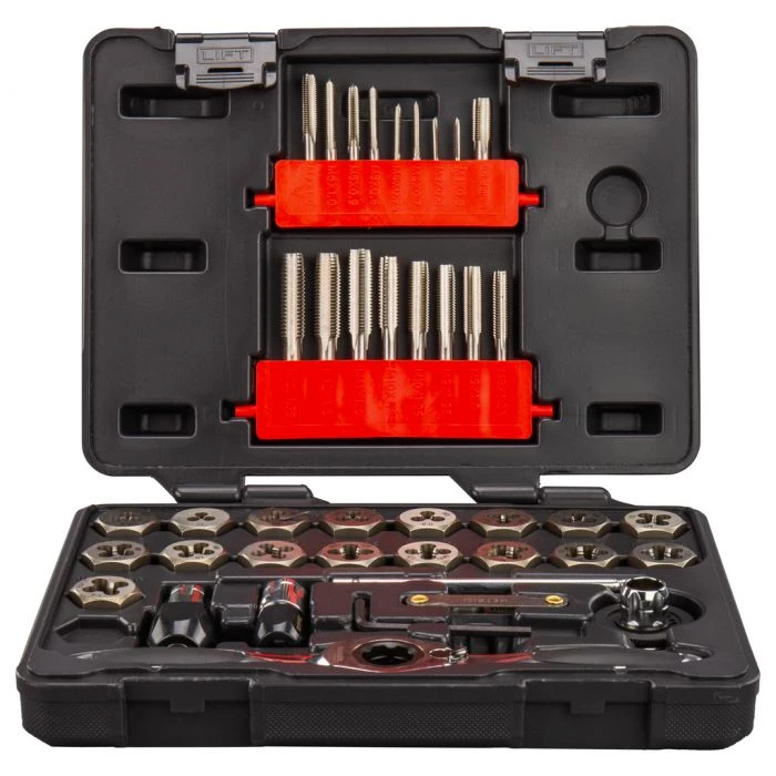 Bestaat uit snijplaathouder, kleine tap adapter, middelgrote tap adapter, middelgrote zeskant snijplaat adapter, schroevendraaier, schroefdraadmeter, NC Hex snijplaat 3mmx0.50, 3mmx0.60, 4mm x 0.70, 4mm x 0.75, 5mm x 0.80, 5mm x 0.90, 6mm x 1.00, 7mm x 1.00, 8mm x 1.25, 9mm x 1.25, 10mm x 1.50, 11mm x 1.50, 12mm x 1.75, NC plug tap 8mm x 1.25, 9mm x 1.25, 10mm x 1.50, 11mm x 1.50, 12mm x 1.75, NC Taper Tap 3mm x 0.50, 3mm x 0.60, 4mm x 0.70, 4mm x 0.75, 5mm x 0.80, 5mm x 0.90, 6mm x 1.00 , 7mm x 1.00, NF Hex snijplaat 9mm x 1.00, 10mm x 1.25, 12mm x 1.50, NF Plug Tap 9mm x 1.00, 10mm x 1.25, 12mm x 1.50 , BSP Hex snijplaat 1/8-28, BSP Tap1/8-28.