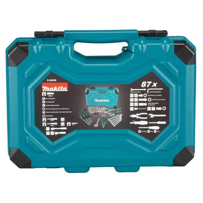 Deze 87-delige handgereedschapset in kunststof koffer bestaat onder andere uit een 40-delige schroefbitset, 5-delige steek-/ringsleutelset, inbussleutelset, 23-delige doppenset, 1/2″ ratel, dubbelzijdige ratelsleutel, 2 dopadapters, 3 bougiedoppen, combinatietang , verstelbare moersleutel en een ratel bitschroevendraaier.