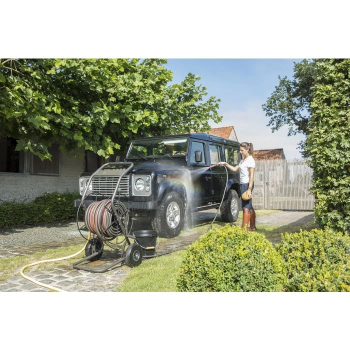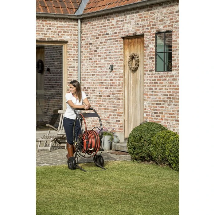 De professionele slangenwagen van het merk Polet is voorzien van een gepoedercoate metalen trommel met degelijke messing koppeling en heeft een ergonomische hoogte met een softgrip handgreep.