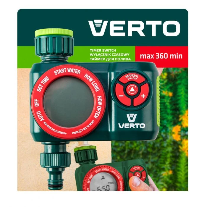 VERTO digitale tijdschakelaar (ref. Nr. 15G751) beschikt over 4 functiebedieningsknoppen. Met de timer kunnen 13 waterfrequenties worden geprogrammeerd binnen een bereik van 360 minuten. Het apparaat beschikt over een batterijniveau-indicator. Voorzien van Nederlandse gebruiksaanwijzing.