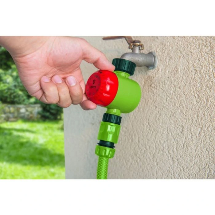VERTO-tijdschakelaar (ref. Nr. 15G750) maakt het mogelijk om handmatig via de draaiknop de sproeitijd in te stellen tot 120 minuten. De tijdschakelaar is geschikt voor standaard buitenkranen met een uitloop van 3/4 ” ( +/- 26mm ).