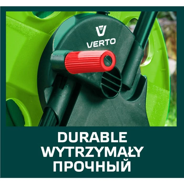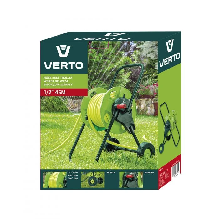 VERTO slanghaspelwagen (ref. Nr. 15G791). Deze mobiele trolley is gemaakt van duurzaam kunststof en wordt gebruikt voor het gemakkelijk bewateren, transporteren en bewaren van een tuinslang. De trolleyhaspel kan ongeveer 45 m 1/2 “slang, 35 m 5/8” slang, 15 m 3/4 “slang bevatten. Wordt geleverd zonder slang.
