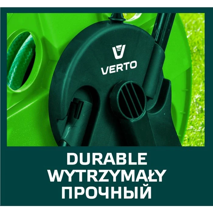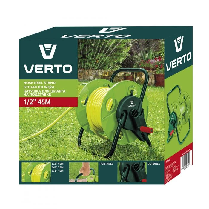 VERTO tuinslanghaspelstandaard (ref. Nr. 15G790). De standaard is gemaakt van duurzaam plastic en wordt gebruikt voor het gemakkelijk bewateren, dragen en opbergen van een tuinslang. Deze slanghaspel kan ongeveer 45 m 1/2 “slang, 35 m 5/8” slang, 15 m 3/4 “slang bevatten. Wordt geleverd zonder slang.