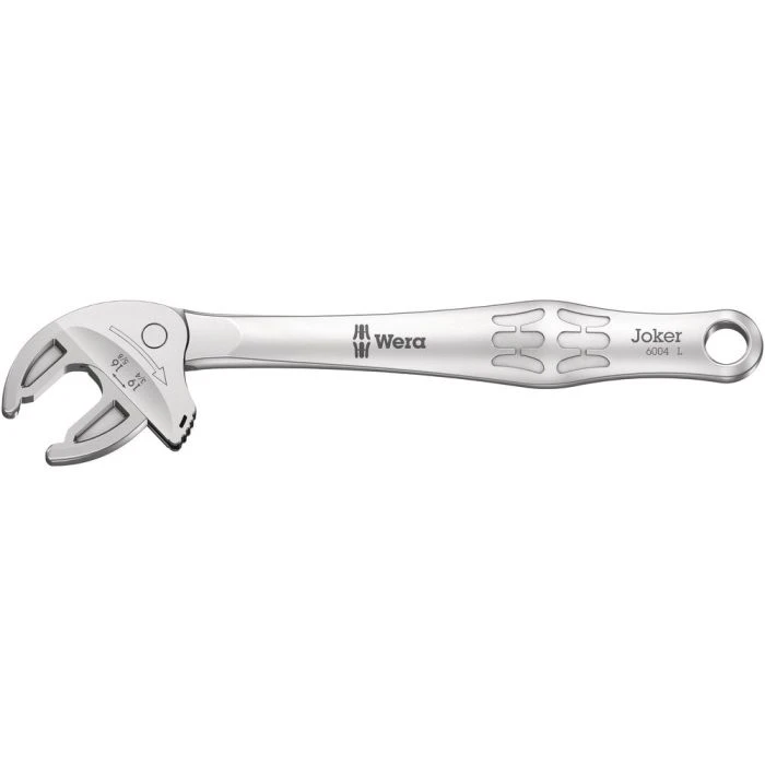 Veel gebruikers zouden graag willen beschikken over een universeel gereedschap dat voor zoveel mogelijk zaken te gebruiken is. Eén stuk gereedschap voor meerdere metrische en duimse maten. En dit zou zich dan ook nog eens automatisch aan de verschillende schroefmaten moeten aanpassen. Veilig vastgrijpen, niets beschadigen en een hoge werksnelheid mogelijk maken. Middels de traploos en parallel lopende bekken worden meerdere steeksleutelformaten vervangen. De vereiste maat wordt automatisch bij het aanzetten op de zeskant-moer en schroef ingesteld. Het geïntegreerde hefboommechanisme klemt de zeskant-schroef resp. moer tussen de bekken veilig in, hetgeen het risico op wegglijden en beschadigingen aanzienlijk verkleint. De ratelfunctie maak snel en soepel schroeven zonder telkens het gereedschap te moeten verplaatsen mogelijk. Door toepassing van hoekprisma’s wordt een terughaalhoek van slechts 30° gerealiseerd. De 1-zijde-constructie in combinatie met de ratelfunctie en het hoekprisma maakt werken in krappe ruimtes mogelijk. De instelbare Joker 6004 is hét universele schroefgereedschap. Zelfinstellend. Vastgrijpend.