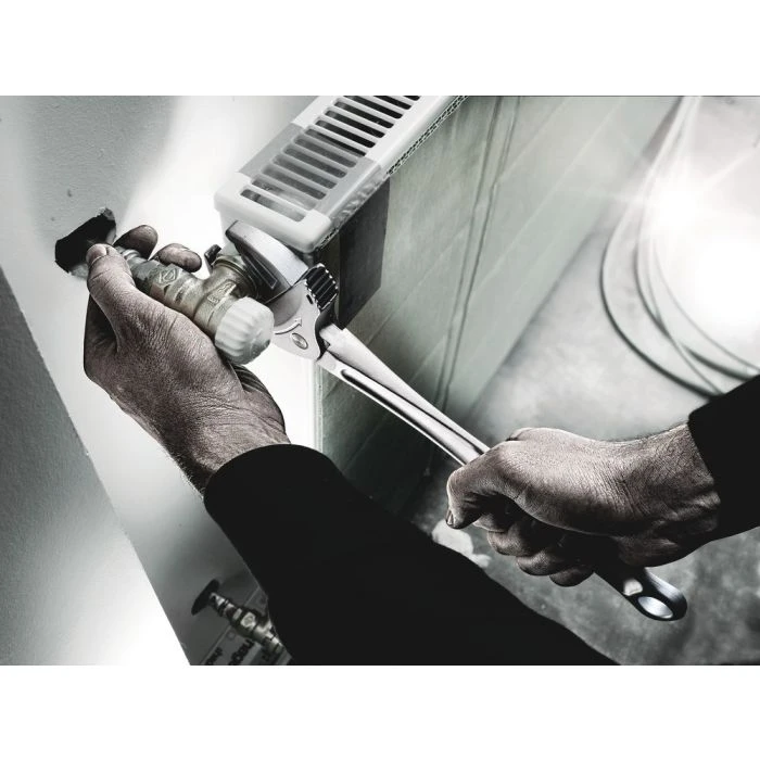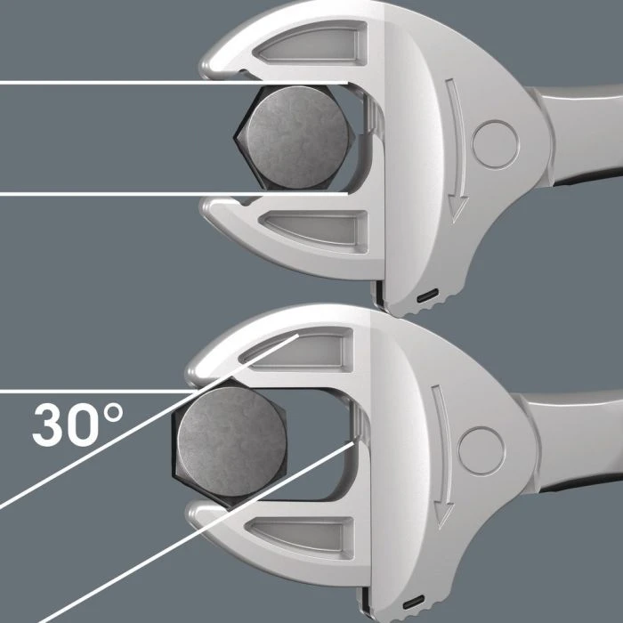 Veel gebruikers zouden graag willen beschikken over een universeel gereedschap dat voor zoveel mogelijk zaken te gebruiken is. Eén stuk gereedschap voor meerdere metrische en duimse maten. En dit zou zich dan ook nog eens automatisch aan de verschillende schroefmaten moeten aanpassen. Veilig vastgrijpen, niets beschadigen en een hoge werksnelheid mogelijk maken. Middels de traploos en parallel lopende bekken worden meerdere steeksleutelformaten vervangen. De vereiste maat wordt automatisch bij het aanzetten op de zeskant-moer en schroef ingesteld. Het geïntegreerde hefboommechanisme klemt de zeskant-schroef resp. moer tussen de bekken veilig in, hetgeen het risico op wegglijden en beschadigingen aanzienlijk verkleint. De ratelfunctie maak snel en soepel schroeven zonder telkens het gereedschap te moeten verplaatsen mogelijk. Door toepassing van hoekprisma’s wordt een terughaalhoek van slechts 30° gerealiseerd. De 1-zijde-constructie in combinatie met de ratelfunctie en het hoekprisma maakt werken in krappe ruimtes mogelijk. De instelbare Joker 6004 is hét universele schroefgereedschap. Zelfinstellend. Vastgrijpend.