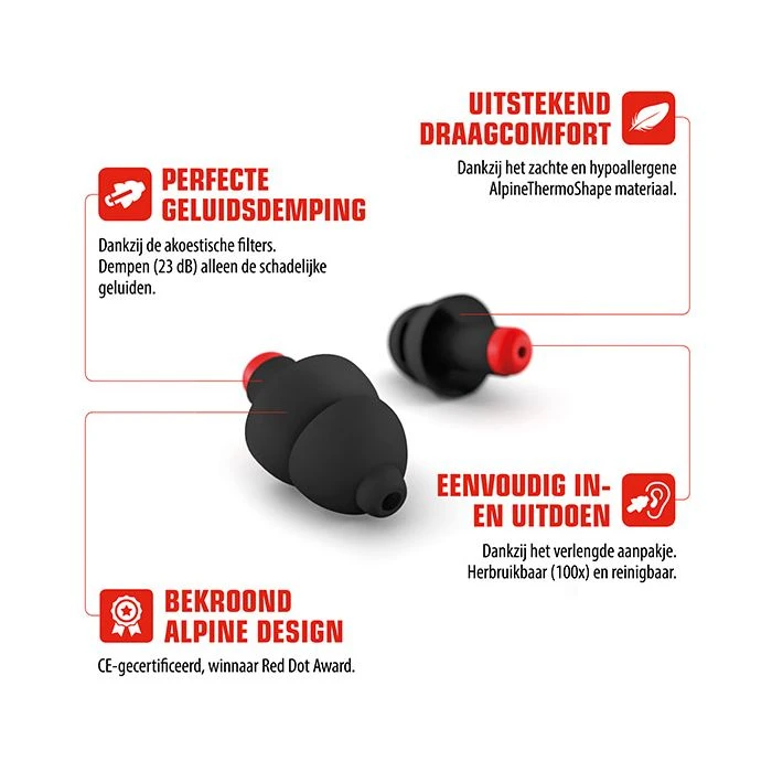 Twintig jaar ervaring heeft er toe geleid dat Alpine een ideaal nieuw model oordop heeft ontwikkelt. De zeer goed doordachte en uitgebreid geteste vorm van de oordoppen, zorgt voor een natuurgetrouwe vlakke demping en een geweldige pasvorm.