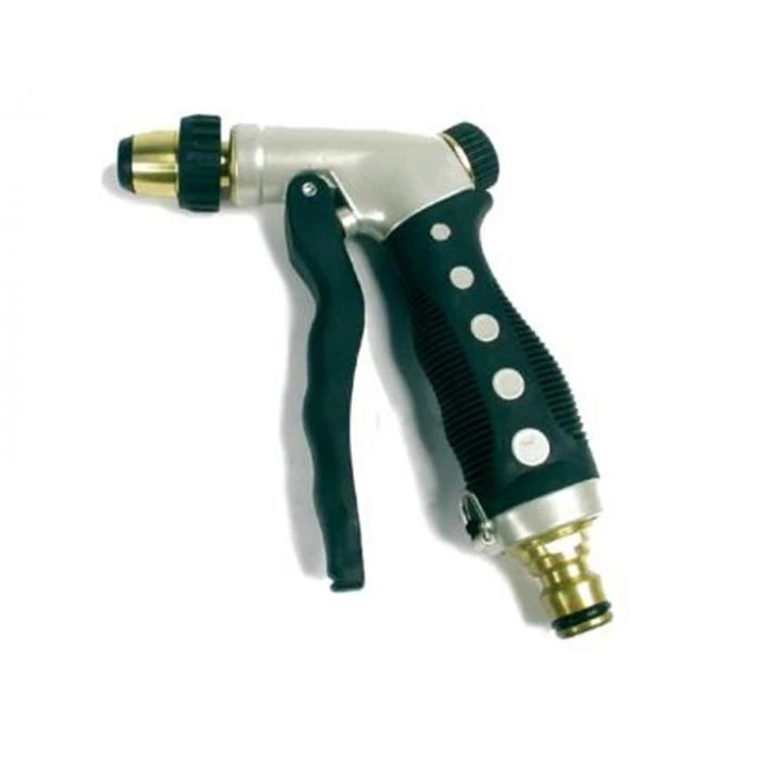 Deze messing pistoolspuit is geschikt voor het gericht besproeien van uw tuin en natuurlijk ook voor planten die in potten staan. U kunt de straal van de spuit regelen van een harde straal tot een fijne nevel door aan het spuitstuk te draaien. Voor langdurig sproeien kan de greep worden vastgezet. Deze spuit is universeel. Deze spuit kan gemonteerd worden aan slangen van 3/4” inch.