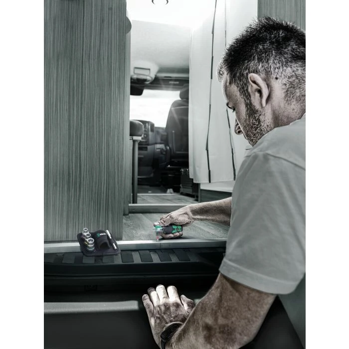 Compacte Zyklop ratel met bitmagazijn die makkelijk in een broekzak te steken is. Magnetische directe bevestiging voor 1/4″ bits en 3/8″ doppen. Gereedschap uiterst snel te wisselen omdat het niet wordt vergrendeld. Dankzij de op 0°, 15° en 90° instelbare kop kan het gereedschap worden gebruikt als ratel en ratelschroevendraaier. De fijne vertanding met 72 tanden maakt een kleine terughaalhoek van slechts 5° mogelijk. Veelzijdig inzetbaar dankzij 12 in de handgreep geïntegreerde bits. Het robuuste ratelmechanisme zorgt voor een voldoende hoog draaimoment. Perfecte combinatie van een Zyklop ratel en een 12-delige schroevendraaierset. De 75 mm lange universele houder voor 1/4″ bits kan als verlengstuk gebruikt worden. Inclusief doppen in gangbare maten. 1 robuust stoffen riemetui 9468 voor bevestiging aan broekriem; ook geschikt voor bevestiging aan het Wera 2go System.
