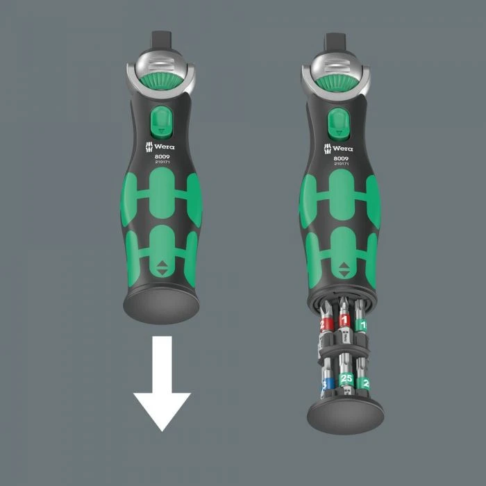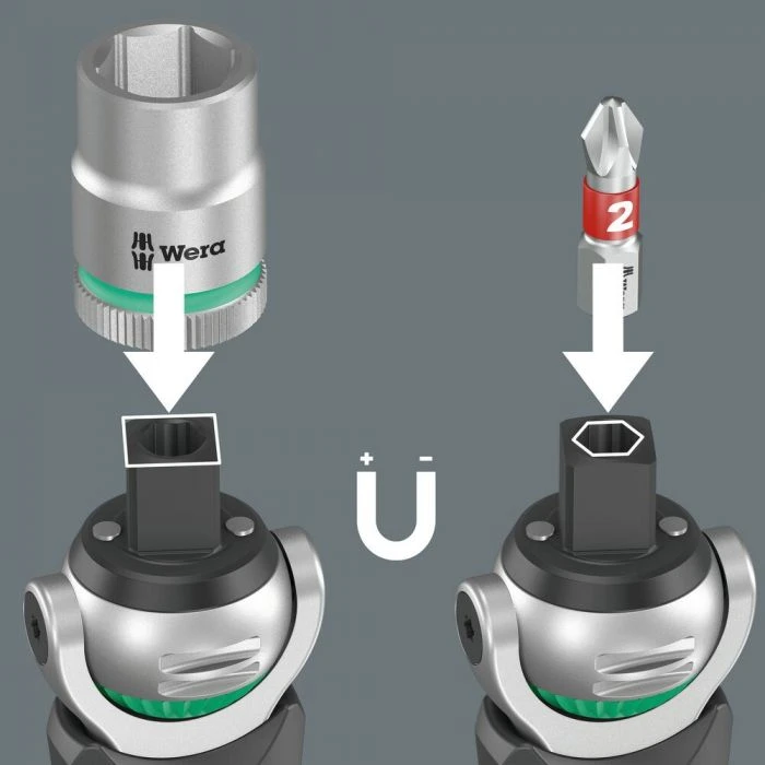 De magnetische directe bevestiging maakt van de 3/8″ ratel tegelijkertijd een bitratelschroevendraaier met 1/4″ bitopname
